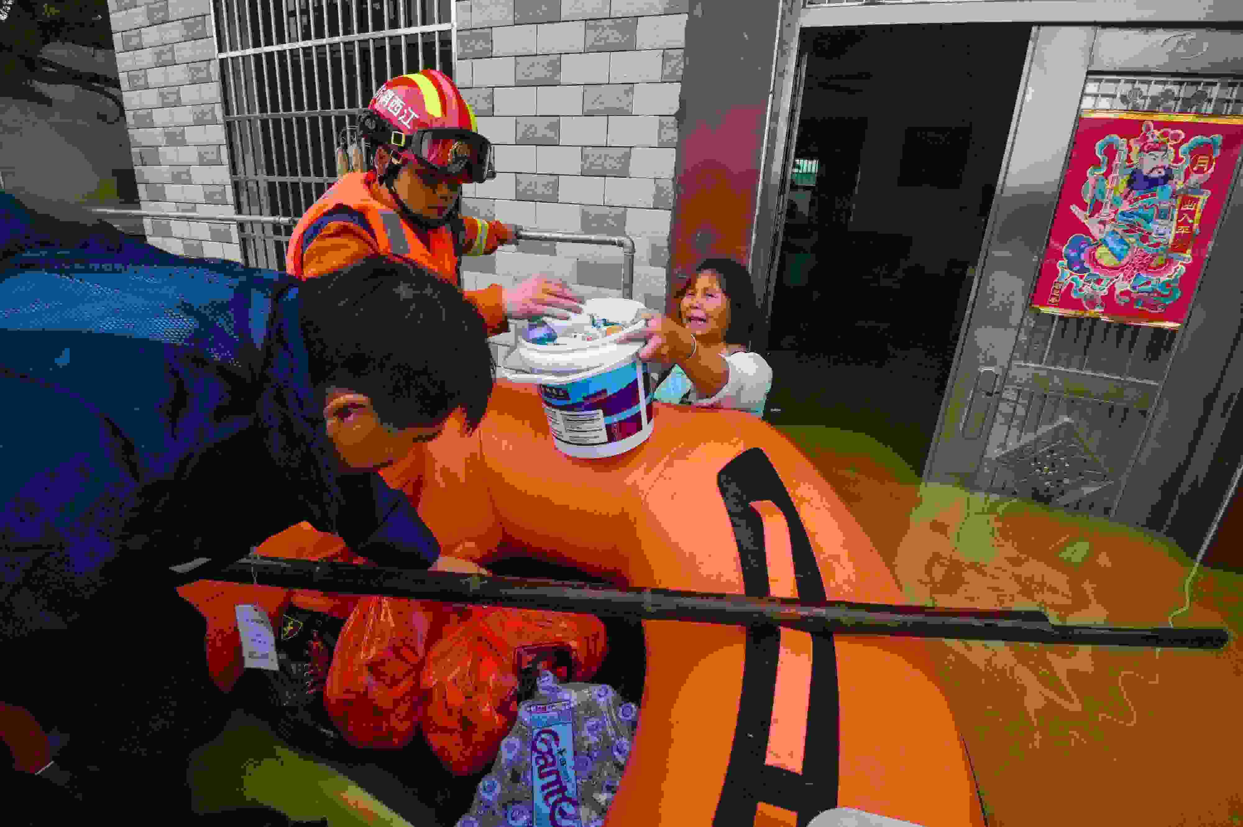2023年5月6日,江西吉安,新干縣消防救援大隊(duì)隊(duì)員在麥斜鎮(zhèn)拿埠村給受困群眾運(yùn)送生活物資。 視覺中國