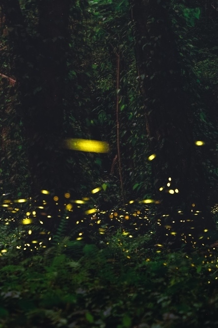 2023年5月7日,夜幕降臨,廣州華南植物園內蘇鐵園前,螢火蟲在林間飛舞。 視覺中國