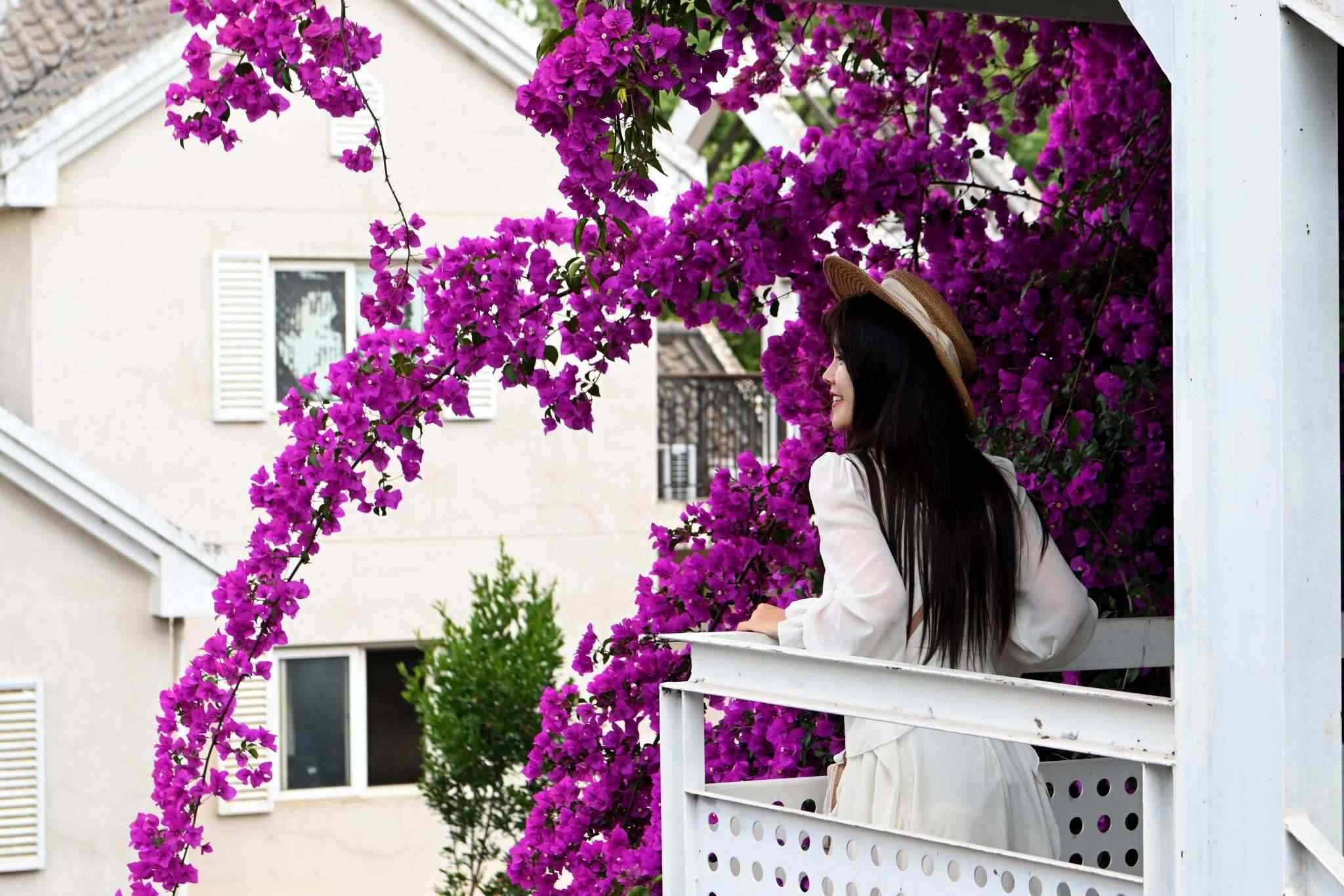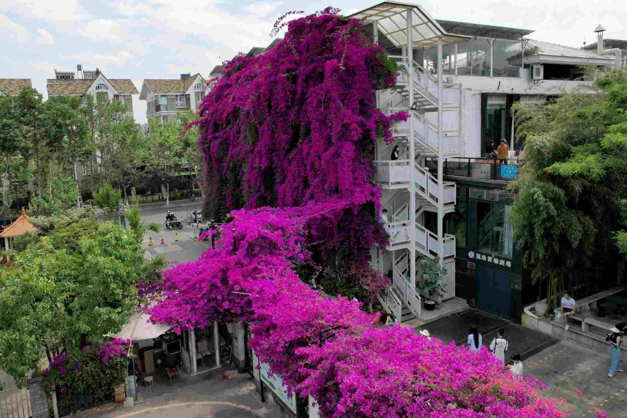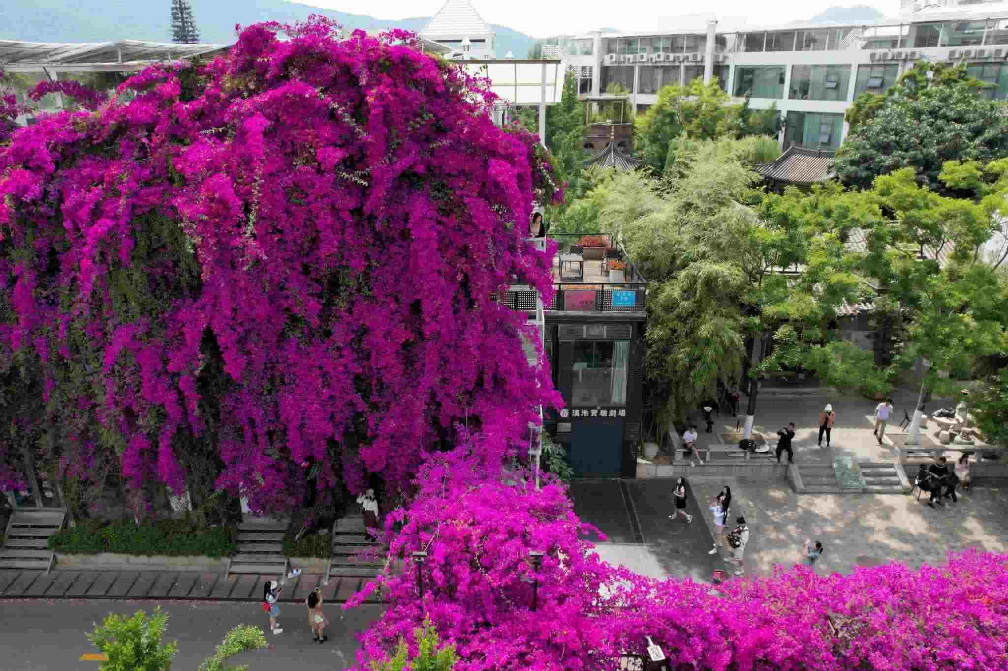 近日,云南省昆明市街頭的三角梅迎來盛花期,盛開的花朵如瀑布般傾瀉而下,吸引許多市民前來觀賞、拍照。 視覺中國