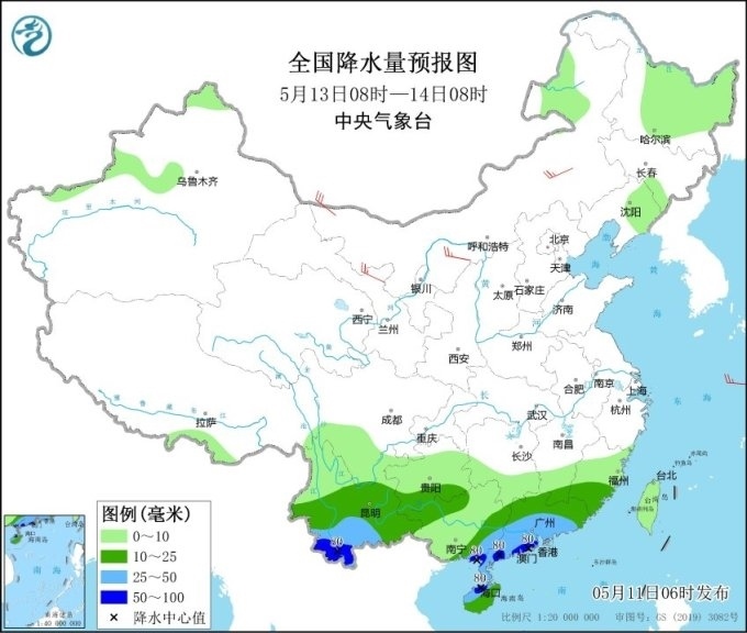 預(yù)計未來三天(11日至13日),華南地區(qū)仍有較強降雨,廣西、廣東、海南島等地大部地區(qū)日雨量有中到大雨,局地暴雨或大暴雨;此外,云南中南部有中到大雨,局地暴雨。