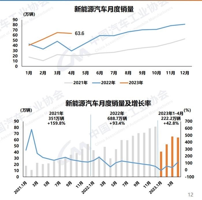 中汽協(xié)數(shù)據(jù)顯示,1-4月,新能源汽車產(chǎn)銷分別完成229.1萬輛和222.2萬輛,同比均增長42.8%,市場占有率達到27%。4月,新能源汽車產(chǎn)銷分別完成64萬輛和63.6萬輛,同比均增長1.1倍,市場占有率達到29.5%。