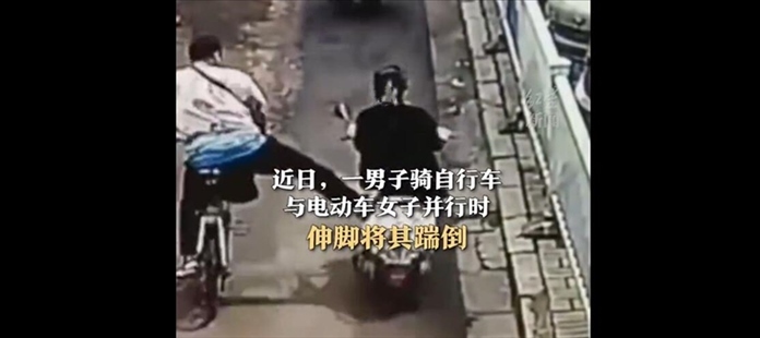·一男子騎自行車與一騎電動車女子并行時伸腳將其踹倒。街道辦回應(yīng):事發(fā)后當?shù)嘏沙鏊槿胝{(diào)查,當事雙方已和解。