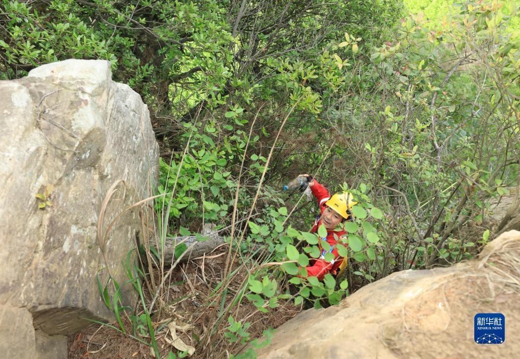 5月14日,張家界市武陵源區(qū)山地應(yīng)急救援隊(duì)隊(duì)員在叢林中撿拾垃圾。