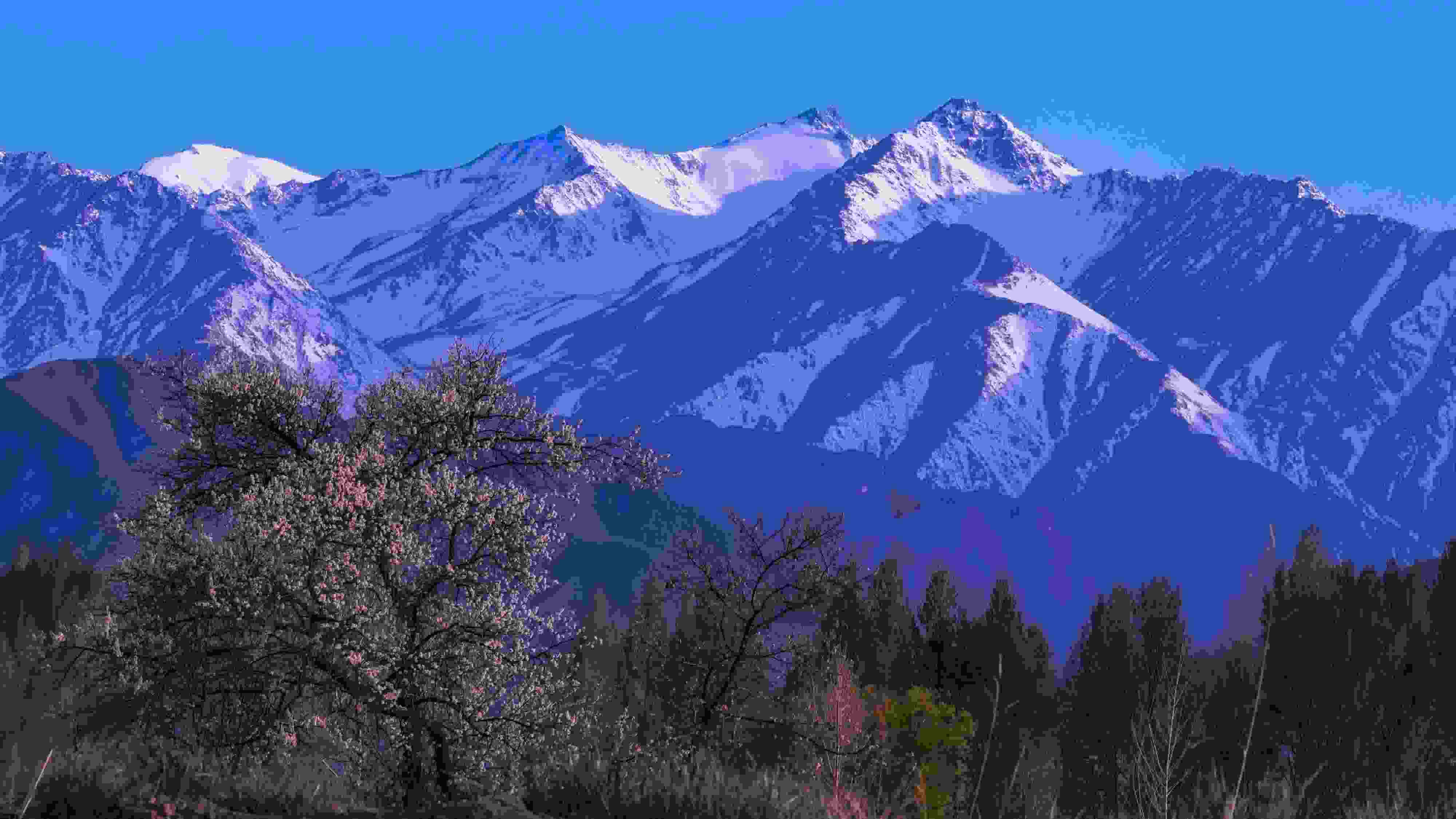 2023年5月14日,甘肅張掖,高臺縣新壩鎮(zhèn),千畝杏林繁花似錦與藍天、雪山交相輝映,把初夏的祁連山區(qū)裝扮得分外美麗。 視覺中國