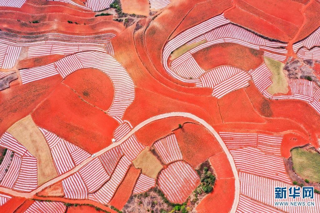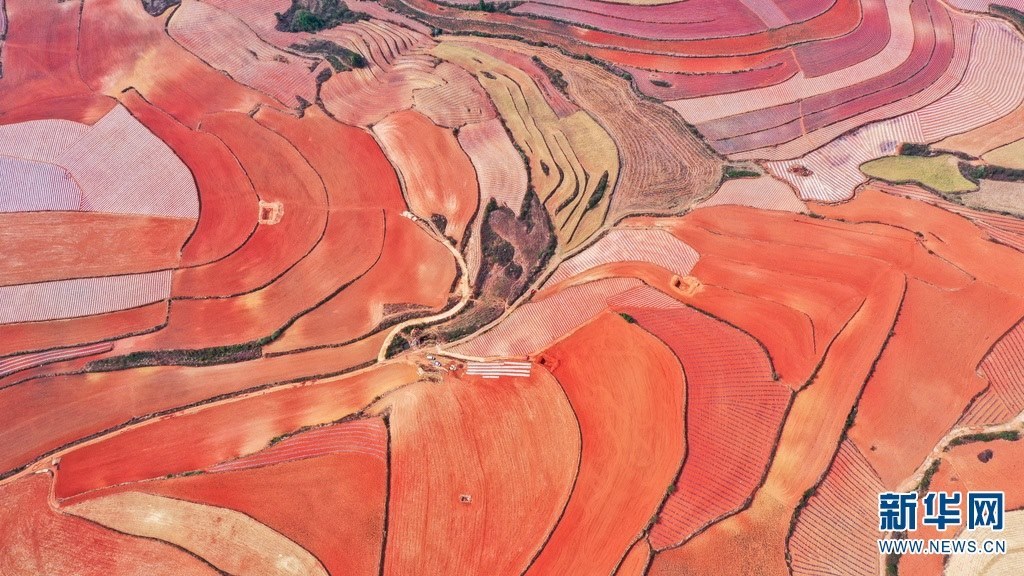 云南省尋甸回族彝族自治縣,連綿不斷的旱梯田遍布山間,遠接天邊,每年4-5月,經(jīng)過村民翻新、平整后的紅褐色土地,從空中俯瞰五彩斑斕、蔚為壯觀。當?shù)卮迕裥燎诟旁诜饰值募t土地上,用勤勞的雙手,繪就一幅幅勞動藝術畫作。新華網(wǎng)發(fā)(孫文來 攝影報道)