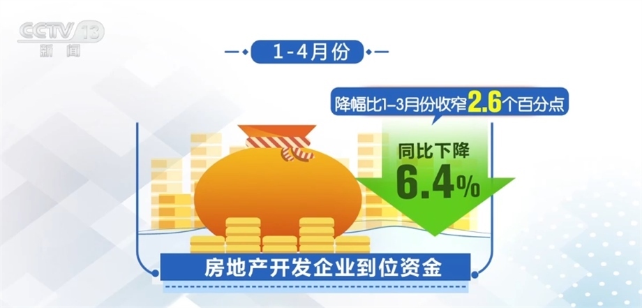 從房企資金看,受到市場銷售改善影響,房地產(chǎn)開發(fā)企業(yè)資金緊張狀況有所緩解,1—4月份,房地產(chǎn)開發(fā)企業(yè)到位資金同比下降6.4%,降幅比1—3月份收窄2.6個百分點。