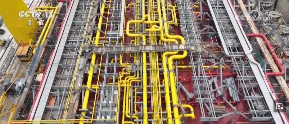 這艘船除了大,技術(shù)也十分先進(jìn)。這上面有一些密密麻麻的管道,是用來處理加工從海底開采出來的原油,再進(jìn)行提煉、分離。其實(shí),我們可以通俗理解它就是一個(gè)海上可以移動(dòng)的化工廠。