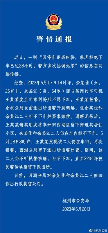 ·近日,杭州兩名乘客與網(wǎng)約車(chē)司機(jī)發(fā)生糾紛,賴(lài)在車(chē)上不走超過(guò)28小時(shí),警方多次調(diào)解無(wú)果,最終兩名乘客被處以行政拘留。