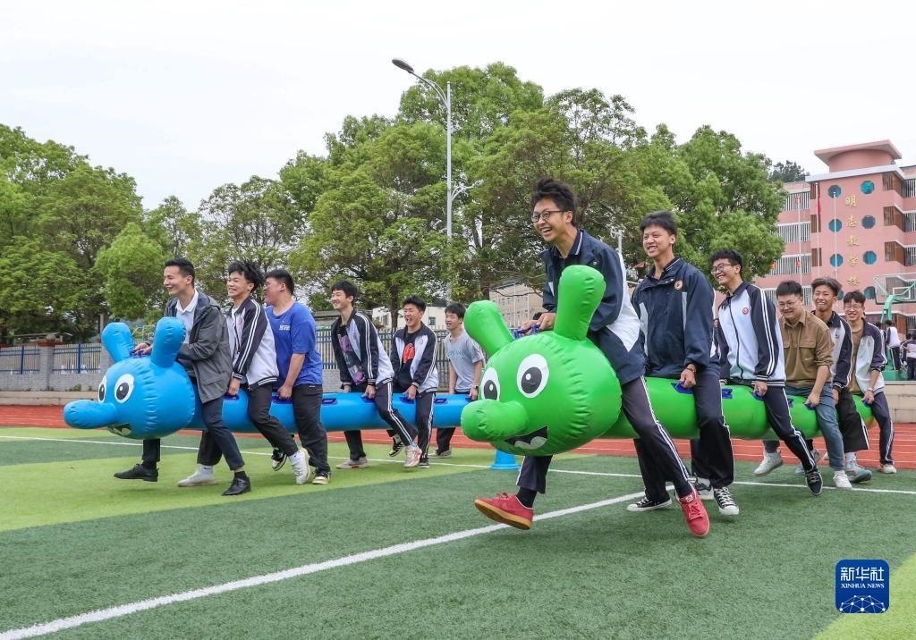 5月23日,四川省廣安市武勝中學(xué)高三學(xué)生開展“同心擊鼓”心理調(diào)適趣味游戲活動。