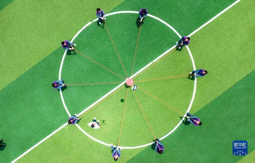 5月24日,貴州省黔西市樹立中學(xué)高三學(xué)生參加“同心擊鼓”游戲釋放壓力(無人機照片)。