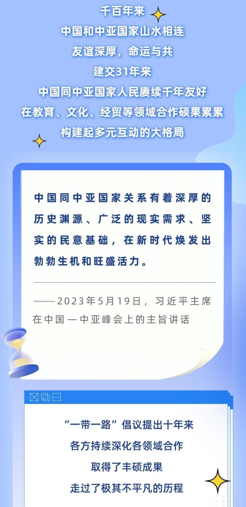 從去年1月的建交30周年視頻峰會,到今年這次中國—中亞峰會,習(xí)近平主席同中亞五國元首連續(xù)兩年集體會晤,并正式成立中國—中亞元首會晤機(jī)制,為中國—中亞關(guān)系發(fā)展作出戰(zhàn)略領(lǐng)航。下面,讓我們一起通過習(xí)近平主席的重要講話,回顧中國與中亞國家源遠(yuǎn)流長的友誼、極其不凡的合作歷程,讀懂中國—中亞峰會的重要意義。