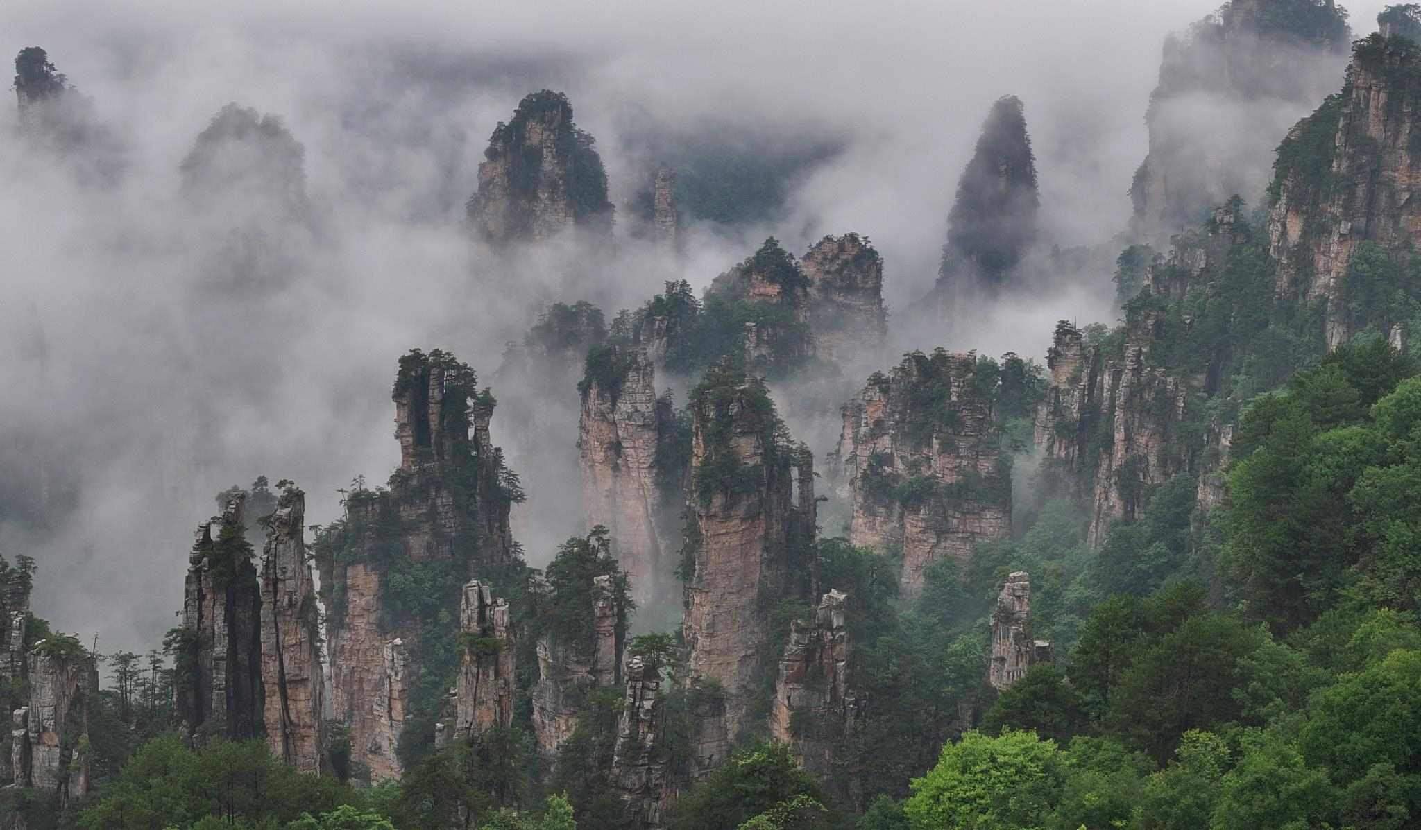 2023年5月27日,湖南張家界,國家森林公園天子山、十里畫廊出現(xiàn)雨后云海勝景,云霧在峰林間變幻飄逸,宛如水墨畫境。視覺中國