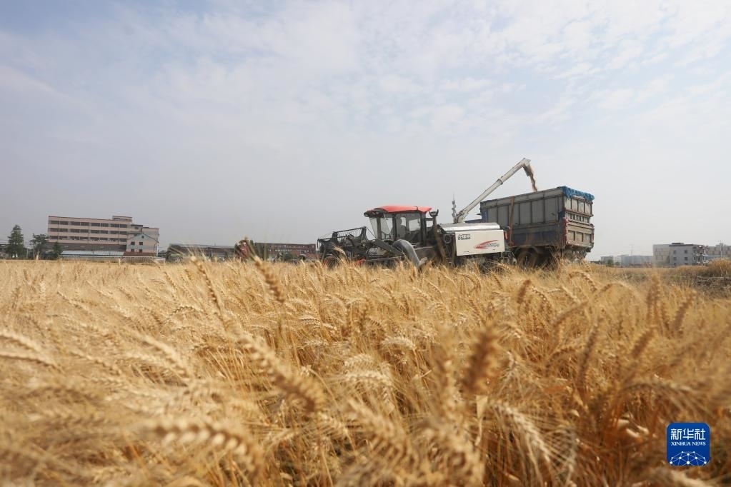 5月27日,在山東省棗莊市光明路街道田莊村麥田里,農(nóng)民駕駛農(nóng)機(jī)收獲小麥。