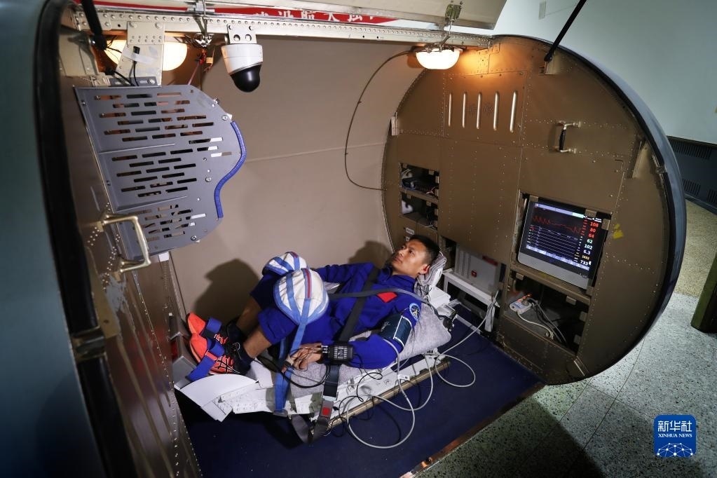 神舟十六號航天員朱楊柱在進(jìn)行振動體驗(2022年4月27日攝)。新華社發(fā)(王夏陽 攝)
