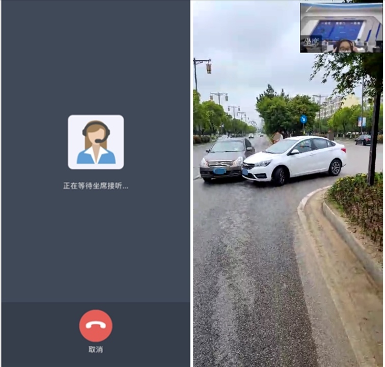 當(dāng)事人點(diǎn)擊“視頻報(bào)警”按鈕后,呼叫等待公安交管部門接警人員接聽,接警人員接聽后進(jìn)入雙方視頻通話。