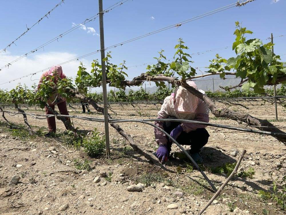 寧夏志輝原石酒莊的葡萄園里,昊苑村的村民們在抹芽。新華社記者艾福梅 攝