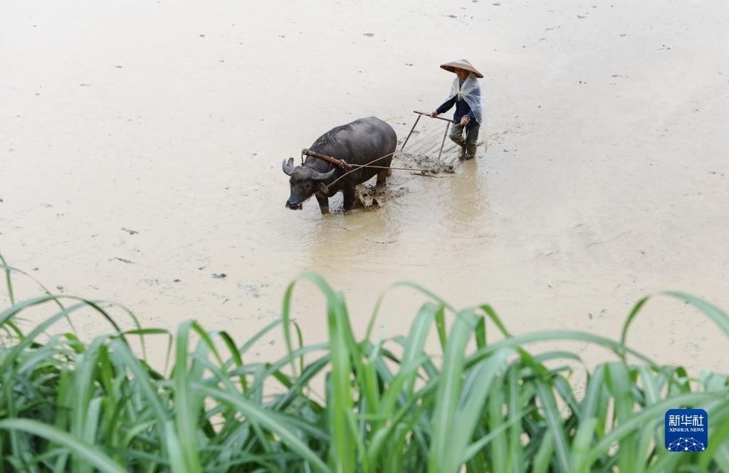 6月5日,在湖南省永州市道縣營(yíng)江街道芒頭寨村,農(nóng)民在平整水田。
