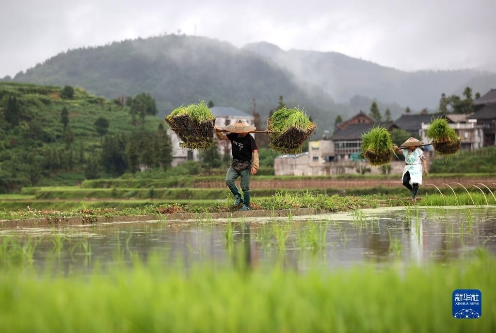6月5日,貴州省黔東南苗族侗族自治州丹寨縣揚(yáng)武鎮(zhèn)長(zhǎng)青社區(qū)村民在田間挑運(yùn)水稻秧苗。
