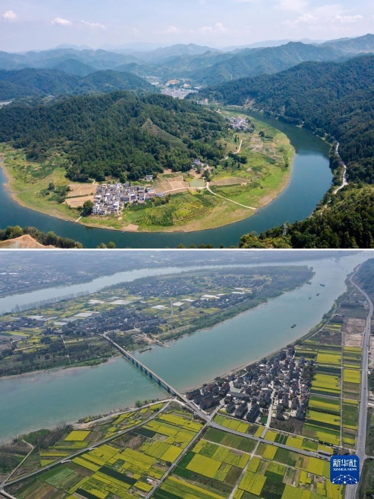 拼版照片:左圖為6月1日拍攝的安徽省黃山市歙縣新安江風(fēng)景(新華社記者張端攝);右圖為2020年9月6日拍攝的浙江省桐廬縣蘆茨村一景(無(wú)人機(jī)照片,新華社記者黃宗治攝)。