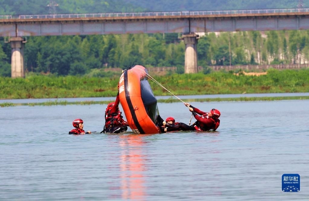 當(dāng)日,在浙江省湖州市長興縣合溪水庫煤山段,煤山鎮(zhèn)組織黨員干部、應(yīng)急管理隊員、志愿者組成應(yīng)急救援隊,開展防汛減災(zāi)應(yīng)急綜合實戰(zhàn)演練,通過沖鋒舟編隊、水上打撈、水上救援等課目訓(xùn)練,增強防汛應(yīng)急處置和水上搶險救災(zāi)能力。新華社發(fā)(許旭 攝)
