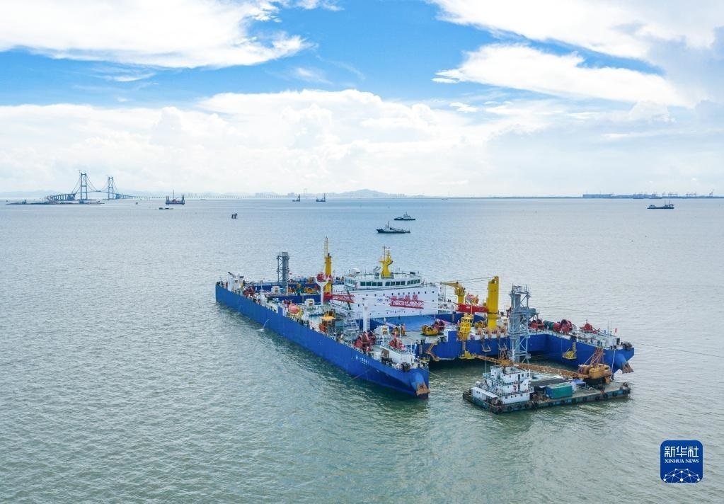 “一航津安1”號沉管運輸安裝一體船在沉放安裝E23管節(jié)和最終接頭,背后是建設(shè)中的深中通道伶仃洋大橋(6月9日攝,無人機照片)。