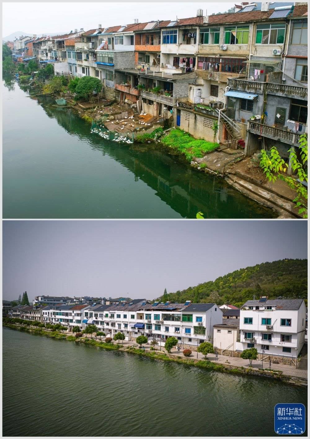 拼版照片:上圖為浙江諸暨市暨南街道街亭村開化江畔的民居(2013年11月13日攝);下圖為村容村貌提升后暨南街道街亭村開化江畔民居新貌(無(wú)人機(jī)照片,2023年4月12日攝)。新華社記者 江漢 攝