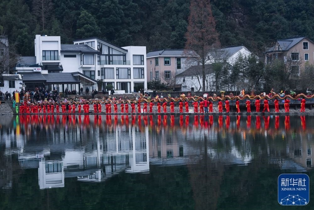 浙江杭州市富陽(yáng)區(qū)湖源鄉(xiāng)窈口村女子板龍隊(duì)在進(jìn)行板凳龍舞龍表演(2月1日攝)。湖源鄉(xiāng)是個(gè)群山環(huán)抱、青山綠水、生態(tài)秀美的山區(qū)鄉(xiāng)鎮(zhèn),近年來(lái),湖源緊抓機(jī)遇,圍繞“樂水湖源、龍鱗+”發(fā)展目標(biāo),立足山水特色,錨定發(fā)展綠色經(jīng)濟(jì),打造獨(dú)具特色的鄉(xiāng)村旅游品牌。新華社記者 徐昱 攝
