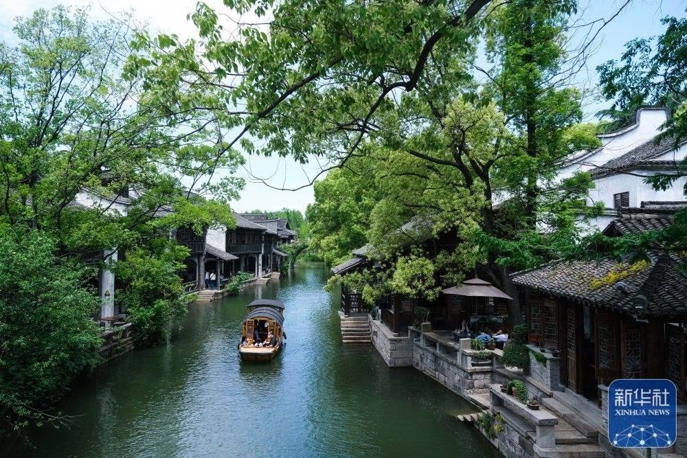 游客乘船在浙江嘉興桐鄉(xiāng)市濮院鎮(zhèn)的濮院時(shí)尚古鎮(zhèn)游覽(5月2日攝)。濮院時(shí)尚古鎮(zhèn)以“歷史街區(qū)再利用”的概念經(jīng)過(guò)10年的升級(jí)改造而成,擁有典型的江南水鄉(xiāng)地貌特征,成功創(chuàng)建為浙江省級(jí)5A級(jí)景區(qū)鎮(zhèn)。新華社記者 徐昱 攝