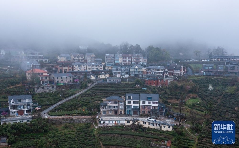 空中俯瞰云霧中的浙江杭州富陽(yáng)里山鎮(zhèn)安頂村(3月23日攝,無(wú)人機(jī)照片)。安頂村海拔700多米,一年中有200多天可觀賞“安頂云?!逼婢埃?dāng)?shù)匕傩找劳懈呱皆旗F茶以及特色鄉(xiāng)村旅游產(chǎn)業(yè),走出了一條茶旅融合的新農(nóng)村共同富裕發(fā)展模式。新華社記者 徐昱 攝