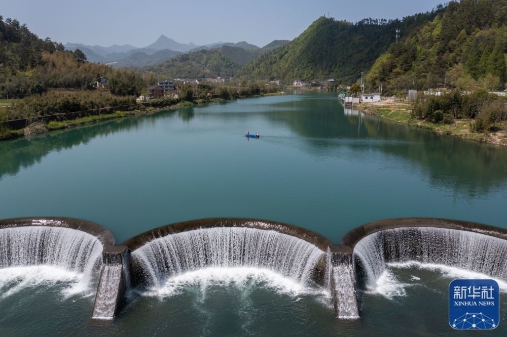 浙江杭州市臨安區(qū)昌化鎮(zhèn)黨員巡河護(hù)水志愿者乘船對(duì)昌化溪進(jìn)行日常河道保潔及巡查(2022年4月7日攝)。新華社記者 徐昱 攝