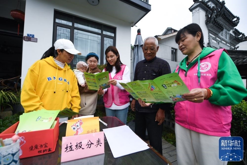 浙江杭州市臨安區(qū)湍口鎮(zhèn)婦聯(lián)組織黨員志愿者在庭院里給村民普及垃圾分類知識(shí),并介紹如何變廢為寶,用廢舊物品美化環(huán)境(2022年4月14日攝)。新華社記者 徐昱 攝