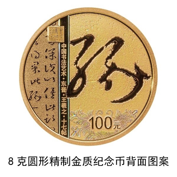 8克圓形金質(zhì)紀(jì)念幣背面圖案為東晉王羲之書《十七帖》局部文字及“緣”字樣與裝飾紋樣、“中國(guó)書法藝術(shù)”篆刻鈐印等組合設(shè)計(jì),并刊“中國(guó)書法藝術(shù)·東晉·王羲之·十七帖”字樣及面額。