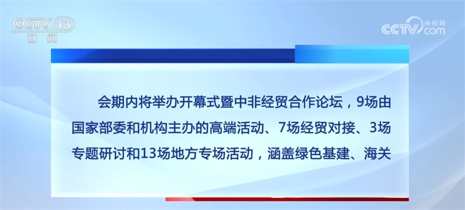 會(huì)期內(nèi)將舉辦開幕式暨中非經(jīng)貿(mào)合作論壇,9場由國家部委和機(jī)構(gòu)主辦的高端活動(dòng)、7場經(jīng)貿(mào)對接、3場專題研討和13場地方專場活動(dòng),涵蓋綠色基建、海關(guān)檢疫、醫(yī)藥衛(wèi)生、農(nóng)食產(chǎn)品、輕工紡織、產(chǎn)業(yè)園區(qū)、婦女青年、職業(yè)教育等領(lǐng)域,還將發(fā)布《中非經(jīng)貿(mào)關(guān)系報(bào)告》、中非貿(mào)易指數(shù)等近20項(xiàng)成果。