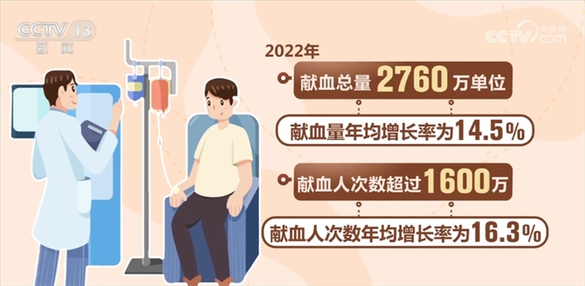 國(guó)家衛(wèi)生健康委相關(guān)負(fù)責(zé)人表示,我國(guó)無償獻(xiàn)血工作目前已形成了“政府主導(dǎo)、部門協(xié)作、社會(huì)支持、公眾參與”的格局,無償獻(xiàn)血制度全面建立,血液管理制度和規(guī)范標(biāo)準(zhǔn)體系不斷完善。全國(guó)建立了橫向到邊、縱向到底的血站采供血服務(wù)體系。全國(guó)共建設(shè)血站453家,形成以省級(jí)血液中心為龍頭、地市級(jí)中心血站為主體、中心血庫為補(bǔ)充的血站服務(wù)體系。我國(guó)血液安全保障水平大幅提升。全國(guó)無償獻(xiàn)血人次數(shù)和獻(xiàn)血量實(shí)現(xiàn)20多年持續(xù)增長(zhǎng),千人口獻(xiàn)血率由1998年的4.8提升至2022年11.5,2022年獻(xiàn)血總量2760萬單位,獻(xiàn)血量年均增長(zhǎng)率為14.5%。2022年獻(xiàn)血人次數(shù)超過1600萬,獻(xiàn)血人次數(shù)年均增長(zhǎng)率為16.3%。今年1—5月,獻(xiàn)血人次數(shù)和獻(xiàn)血量比去年同期增長(zhǎng)7.7%和6%。