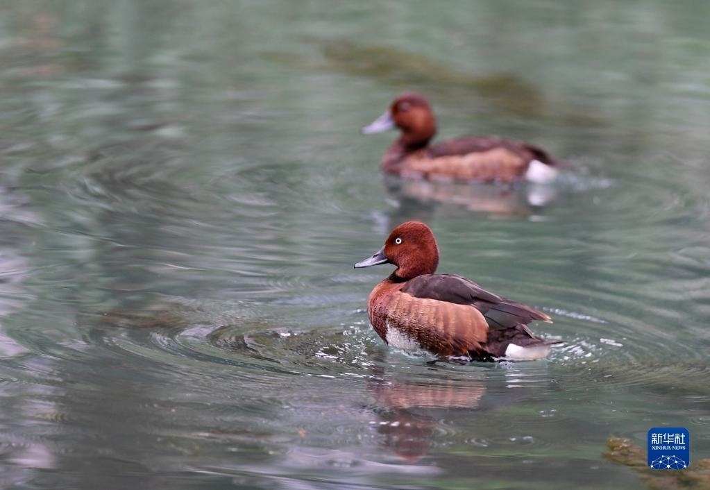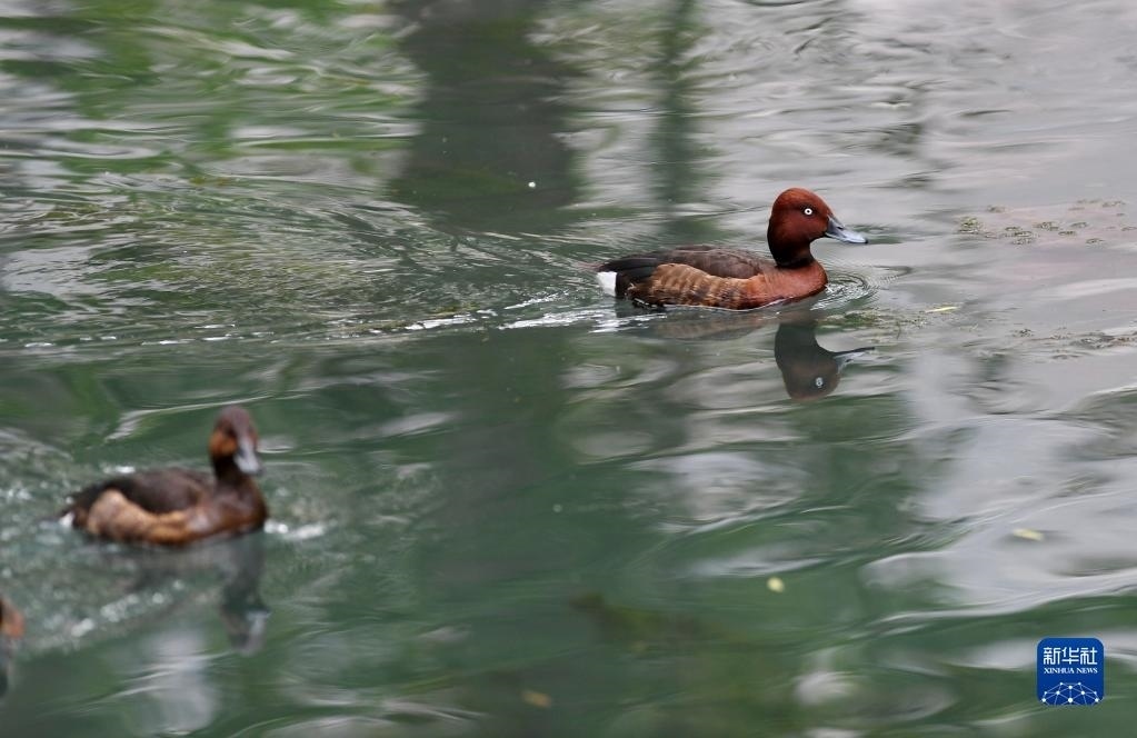 夏日里,白眼潛鴨和鳳頭潛鴨在西藏拉薩市拉魯濕地國家級自然保護區(qū)中干渠里覓食、嬉戲。新華社記者 張汝鋒 攝