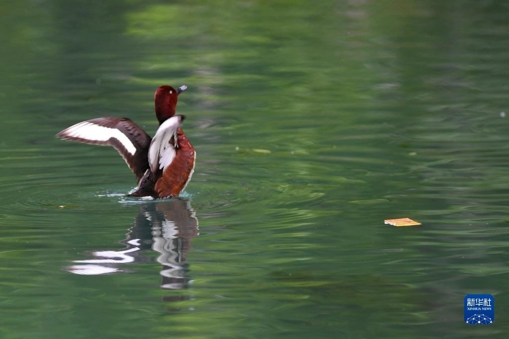 白眼潛鴨在拉魯濕地中干渠里舒展翅膀(6月14日攝)。