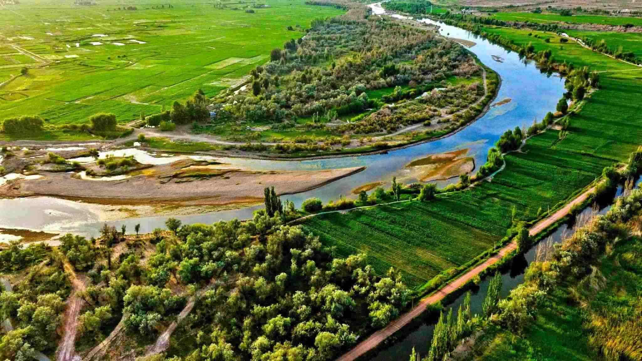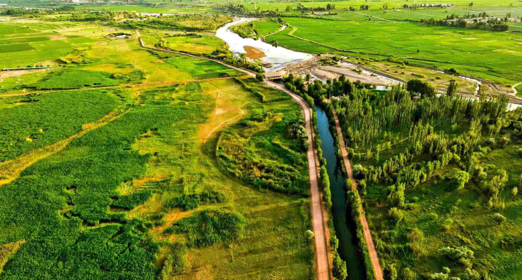 2023年6月15日,甘肅省張掖市,甘州區(qū)靖安鄉(xiāng)、臨澤縣板橋鎮(zhèn)境內(nèi)的黑河兩岸,寬闊的河床、彎曲的河流、農(nóng)作物以及樹木、蘆葦、濕地在夕陽的映照下綠意盎然。視覺中國