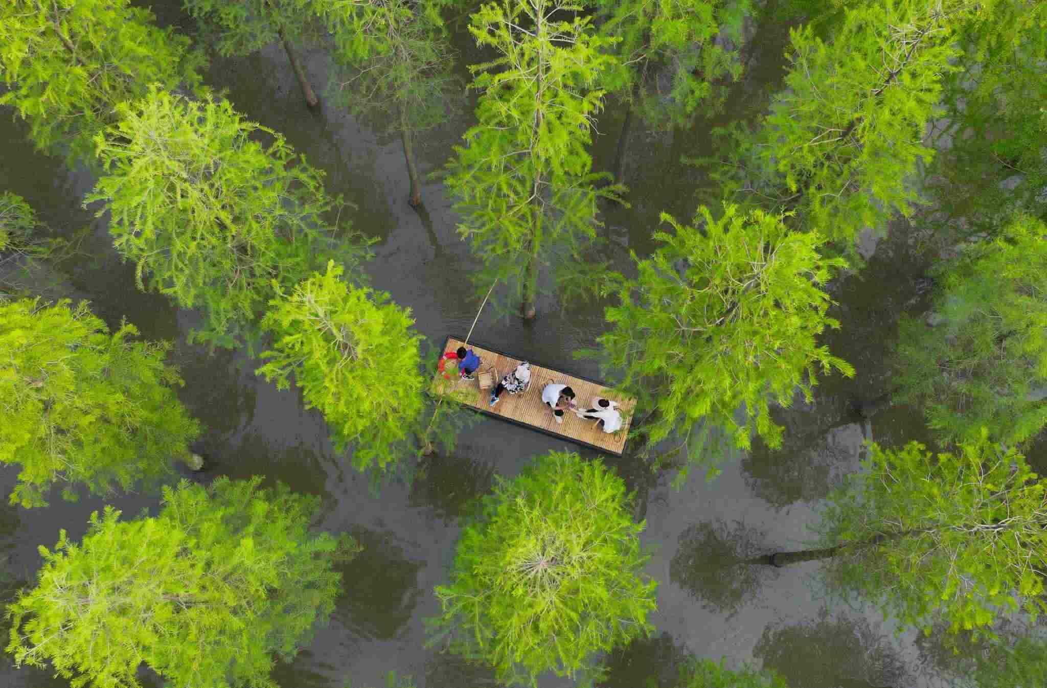 2023年6月16日,江蘇省宿遷市,泗洪縣洪澤湖濕地水杉林滿目蒼翠、郁郁蔥蔥,游客乘坐竹筏,在水杉林間穿梭游玩。視覺(jué)中國(guó)