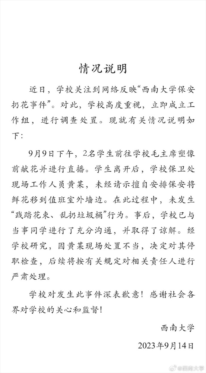 ·西南大學(xué)通報“保安扔花事件”:工作人員處置不當(dāng),決定對其停職檢查。