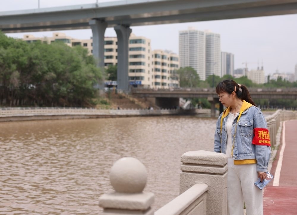 6月3日,在西寧市南川河沿岸,社區(qū)河長蔣曉蕓正在巡河。新華社記者李寧 攝
