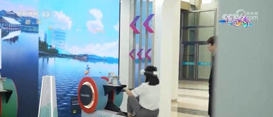 在5G和實時云渲染技術(shù)的支持下,配合劃船機(jī)和VR眼鏡,在主媒體中心就能實現(xiàn)“泛舟西湖”,沉浸式觀賞晴天、雨天等不同天氣情況下,西湖從斷橋到雷峰塔的沿湖美景。并列的兩臺劃船機(jī)還可以聯(lián)機(jī)比賽,讓體驗者在西湖美景中享受運動和VR競技帶來的樂趣。