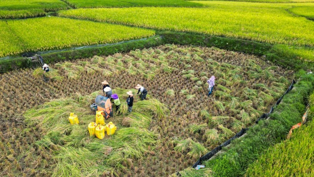 ↑2023年8月26日,湖南省郴州市桂陽縣蓮塘鎮(zhèn)下馬村,農(nóng)民在收割稻谷。CICPHOTO/周秀魚春 攝