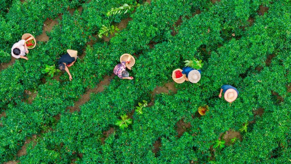 ↑2023年8月28日,河南省商丘市寧陵縣黃崗鎮(zhèn)商會南魏果蔬種植專業(yè)合作社,農(nóng)民在采摘辣椒。CICPHOTO/徐碩 攝