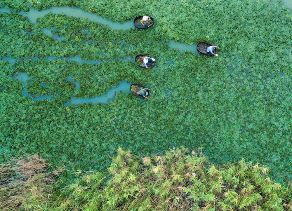 ↑2023年8月24日,浙江省湖州市長興縣夾浦鎮(zhèn)陶家灣村,菱農(nóng)在采收菱角。CICPHOTO/陳海偉 攝