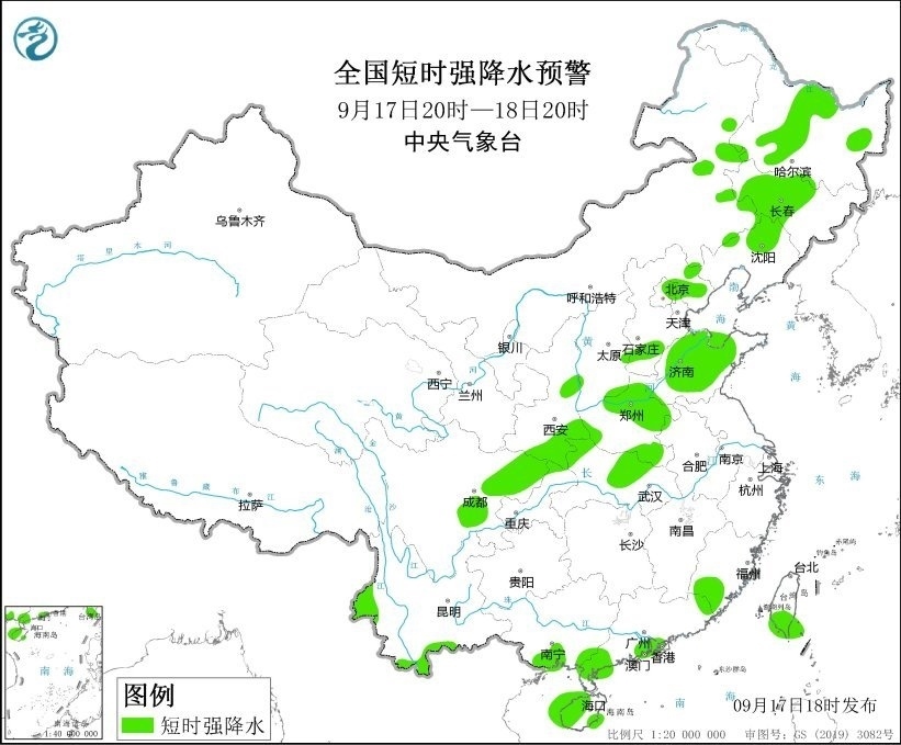 中央氣象臺9月17日18時繼續(xù)發(fā)布強對流天氣藍色預(yù)警