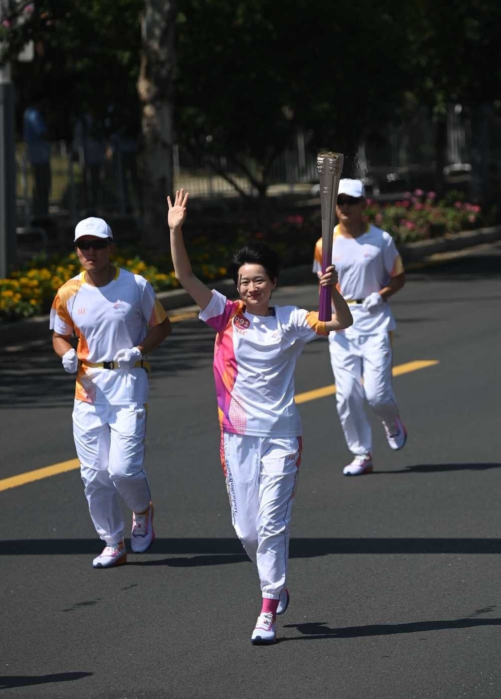↑火炬手董群英在火炬?zhèn)鬟f中。