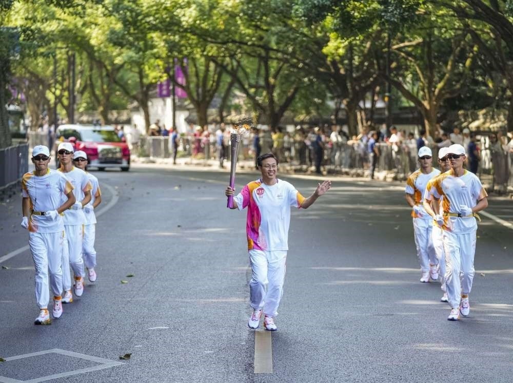 ↑火炬手王懿律在火炬?zhèn)鬟f中。