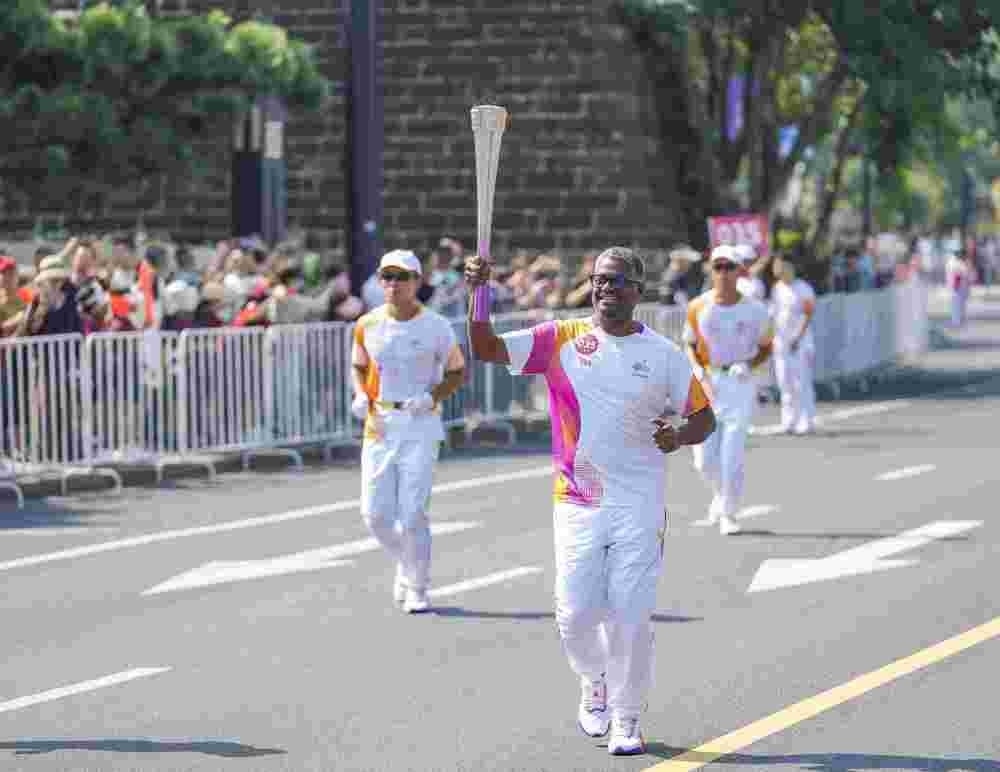 ↑火炬手蔡相理在火炬?zhèn)鬟f中。