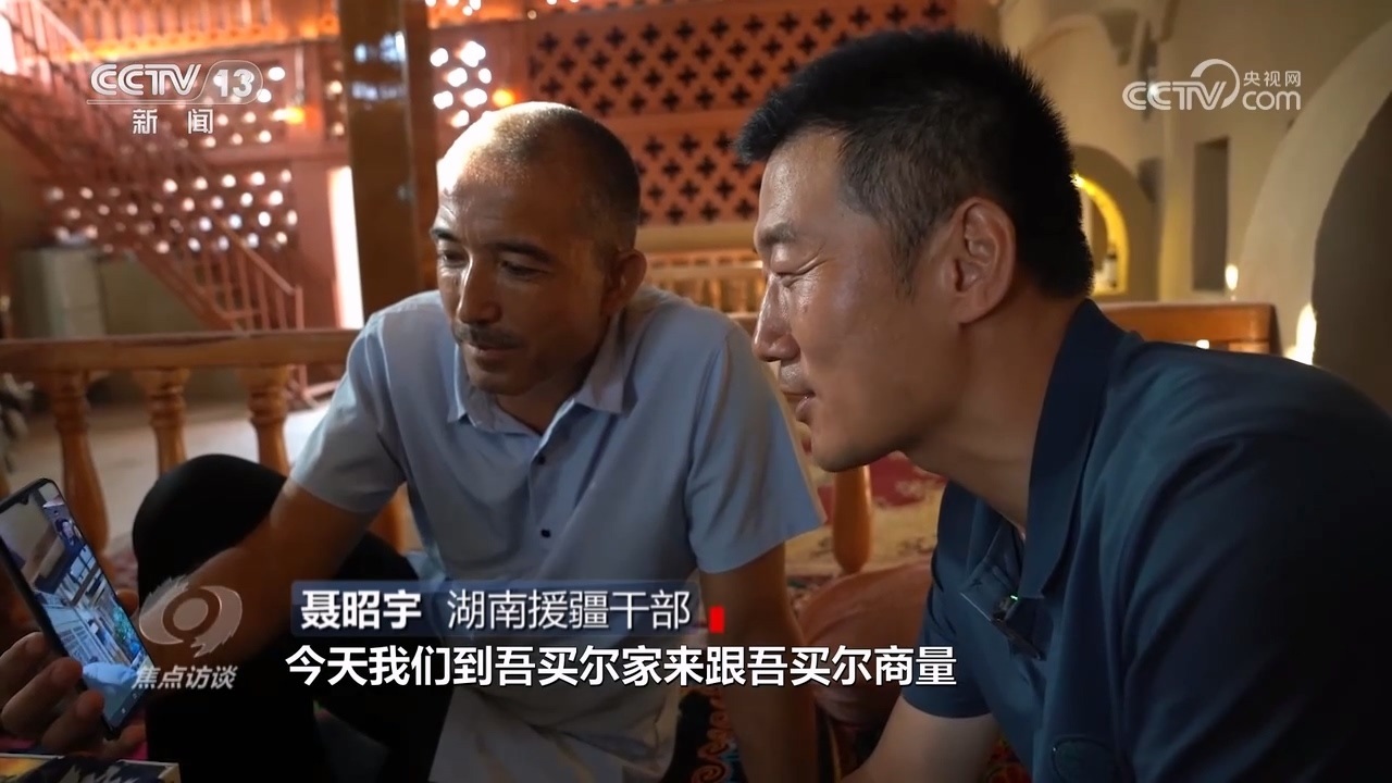 湖南援疆干部聶昭宇:“今天我們到吾買爾家跟吾買爾商量,在他們門前搞一個電商帶貨大比拼,現(xiàn)在這個村每天來了不少人,我們覺得前景挺好?!?/p>
