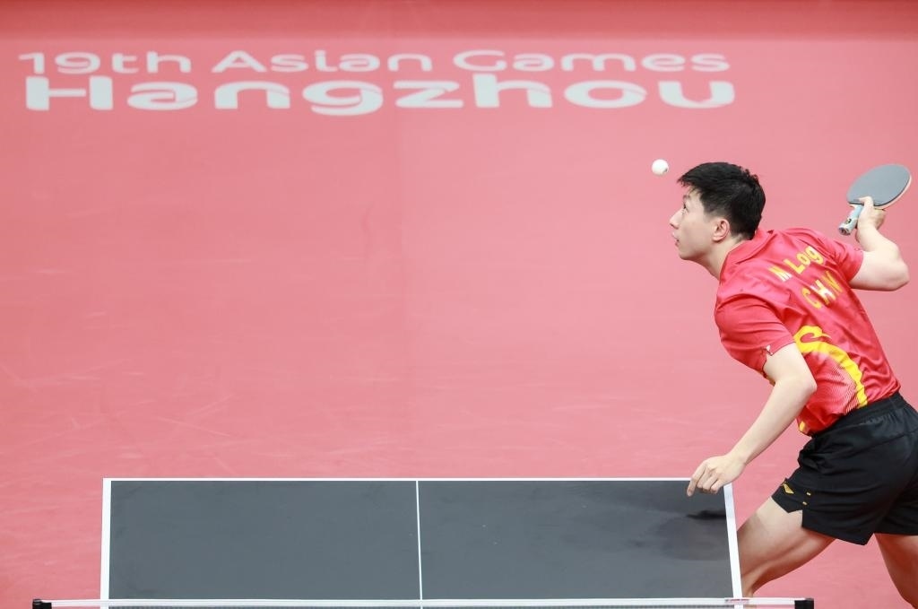 9月22日,中國隊選手馬龍在比賽中發(fā)球。新華社記者 劉續(xù) 攝